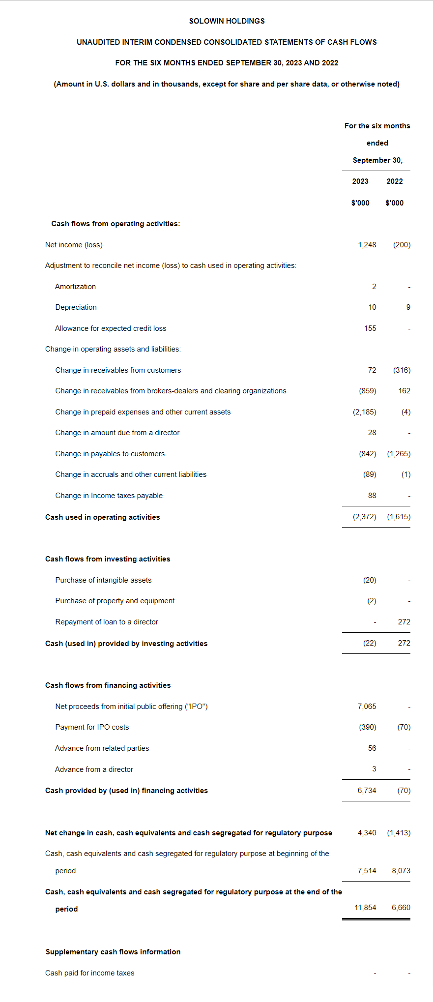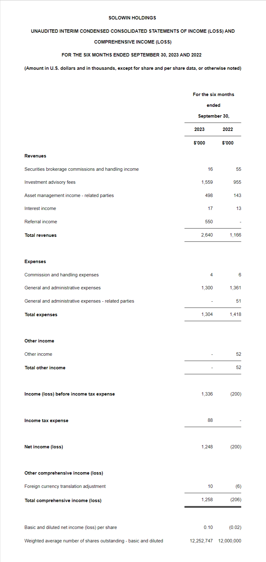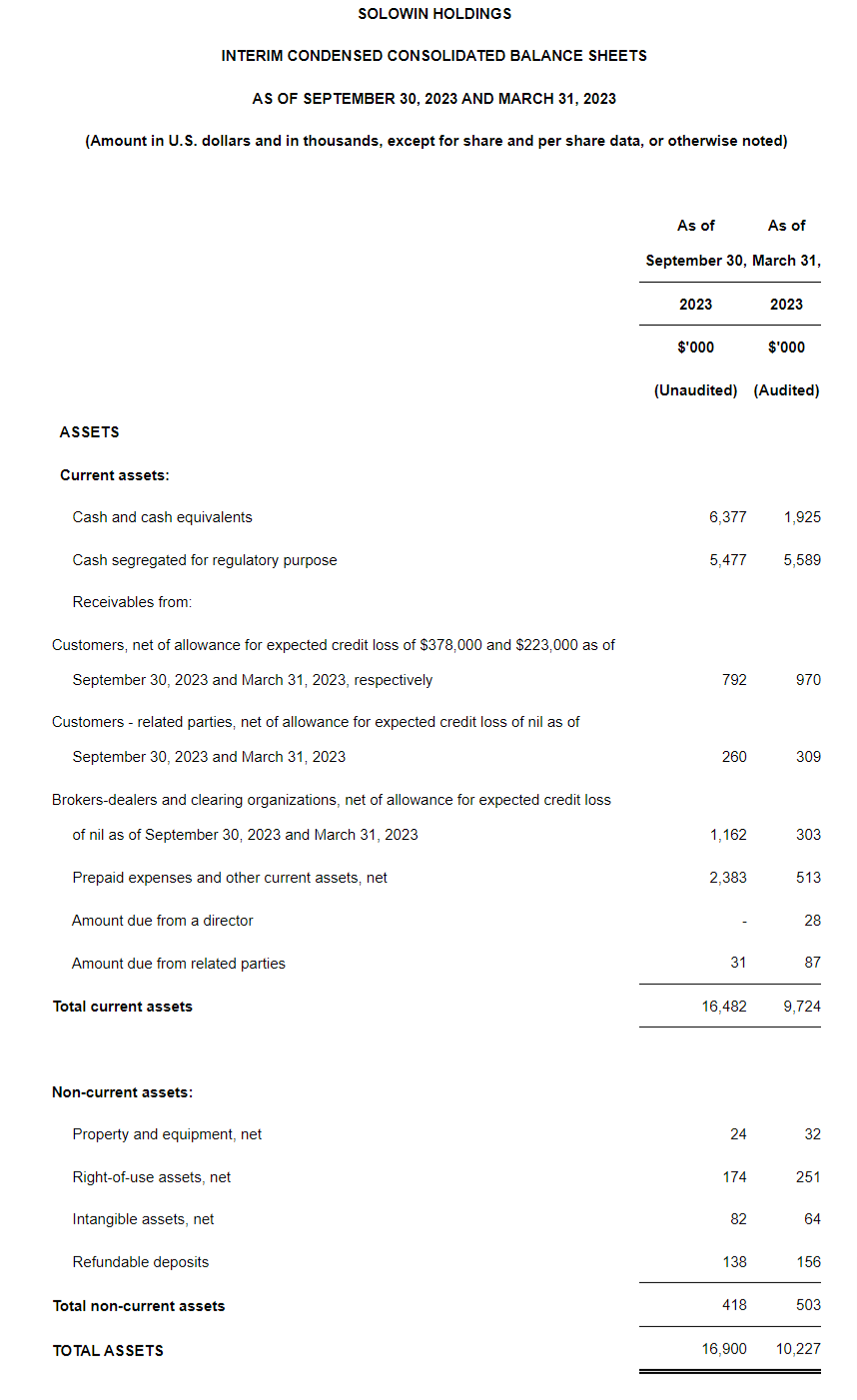Mr. Shing Tak Tam, Chief Executive Officer of SOLOWIN, commented, "It is with great pride that I present our operational and financial achievements for the first time as a public company for the first six months ended September 30, 2023. Despite the sluggish economic recovery plagued by the high interest rates, inflation, inadequate investor confidence and market liquidity, we have achieved a remarkable 126.4% year-on-year revenue growth to $2.64 million. Our net income also experienced a significant increase to $1.25 million, which indicated our enhanced profitability and efficient response to market challenges. Through our subsidiary licensed by the Hong Kong Securities and Futures Commission, we've been dedicated to providing comprehensive financial services and premium user experiences on our one-stop platform."
